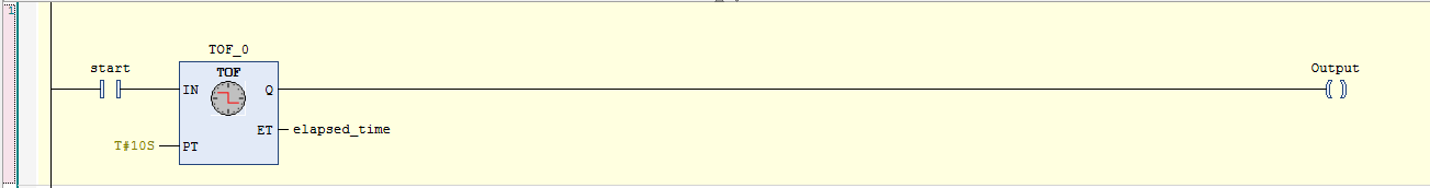 • TOF (Off‑delay)keeps an output ON for a defined time after the input goes FALSE.