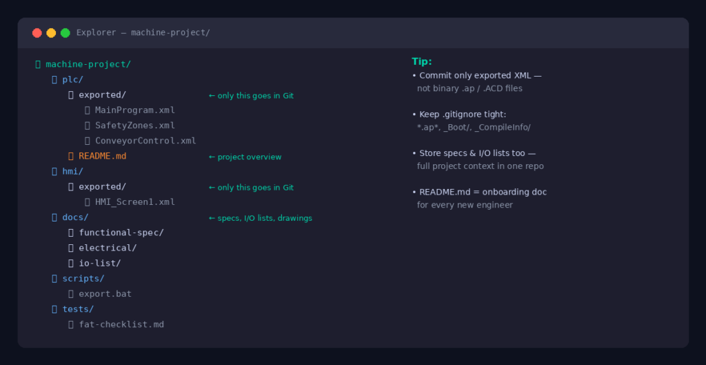 .gitignore: A file that tells Git which files to ignore — compiled outputs, temp files, backups. Crucial in PLC projects where IDEs generate a lot of noise.