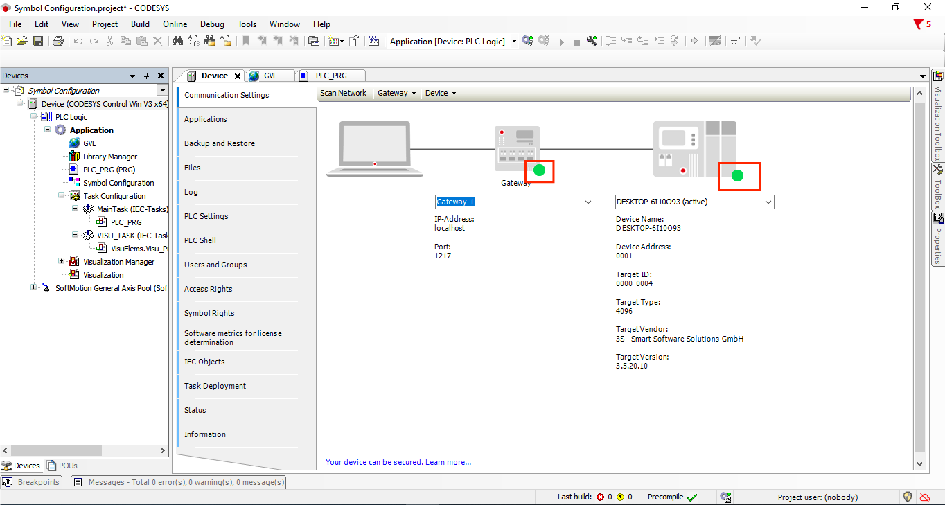 You’re now connected to the virtual PLC. The connection status should show “Online” in CODESYS IDE.