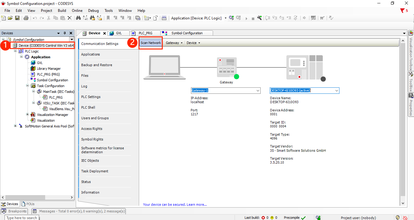 - In CODESYS IDE, open Device window and click on Scan network