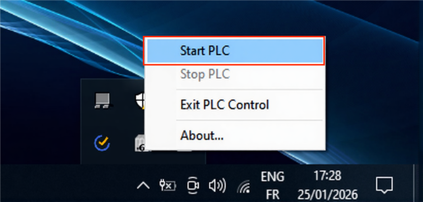 The virtual runtime is now active and listening for connections. You should see a system tray icon indicating the PLC is running.