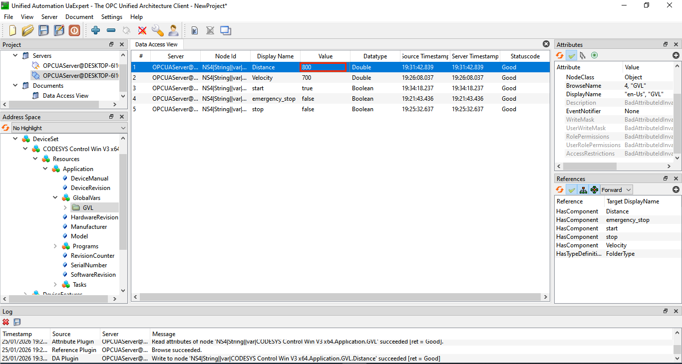 - As your PLC application updates these variables, the values refresh automatically in UaExpert