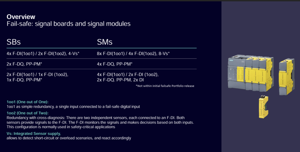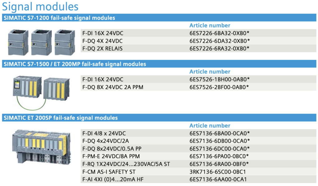 Module examples: S7-1200 SM1226 F-DI/F-DQ – safety modules for small applications, ET 200MP F-DI/F-DQ – modules for S7-1500 controllers, ET 200eco PN – distributed modules for harsh conditions.